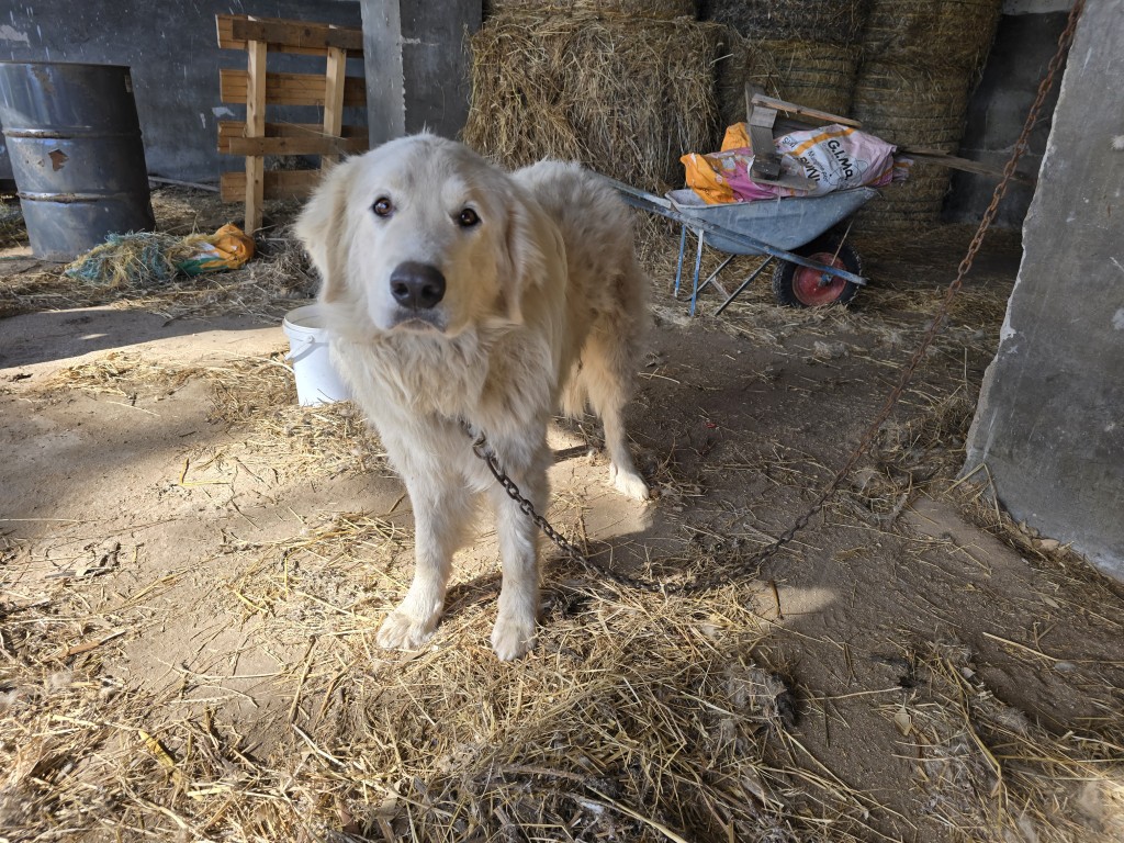 Wir haben Aaron besucht und es tat uns in der Seele weh, ihn an der kurzen Kette in einem Schuppen zu sehen. Aaron ist ein imposanter Bursche, der sich seinem Schicksal fügt. Als wir da waren, sprang noch ein kleiner Dackel um ihn herum, aber an der Kette hatte er wenig Möglichkeit, zu reagieren, sei es mit ihm zu spielen oder ihn zu verjagen. Wir konnten ihn knuddeln, in die Ohren gucken, uns neben ihn setzen – er ließ alles geschehen. Es schien, als würde er es genießen, dass es Menschen gibt, die ihm etwas Aufmerksamkeit schenken und ihn streicheln.