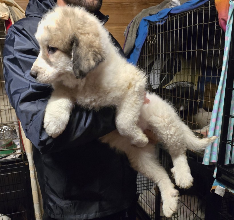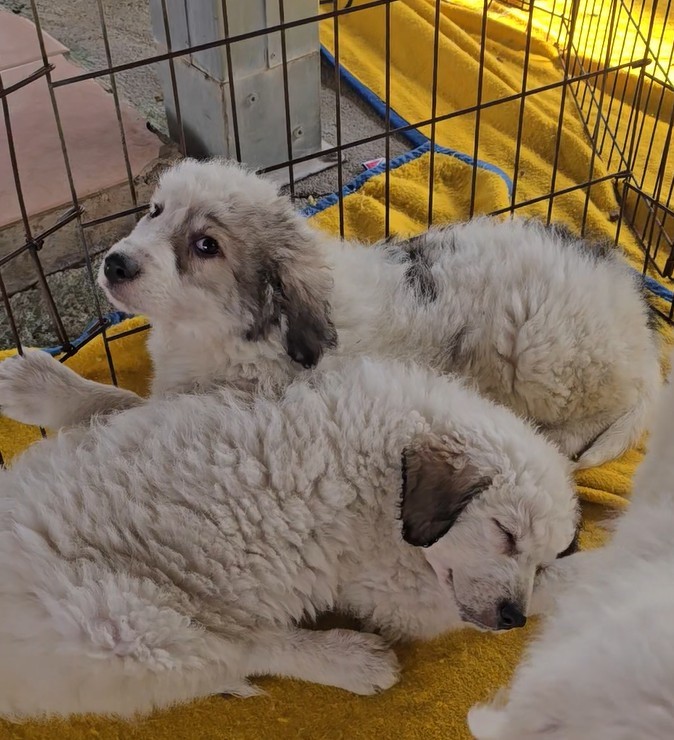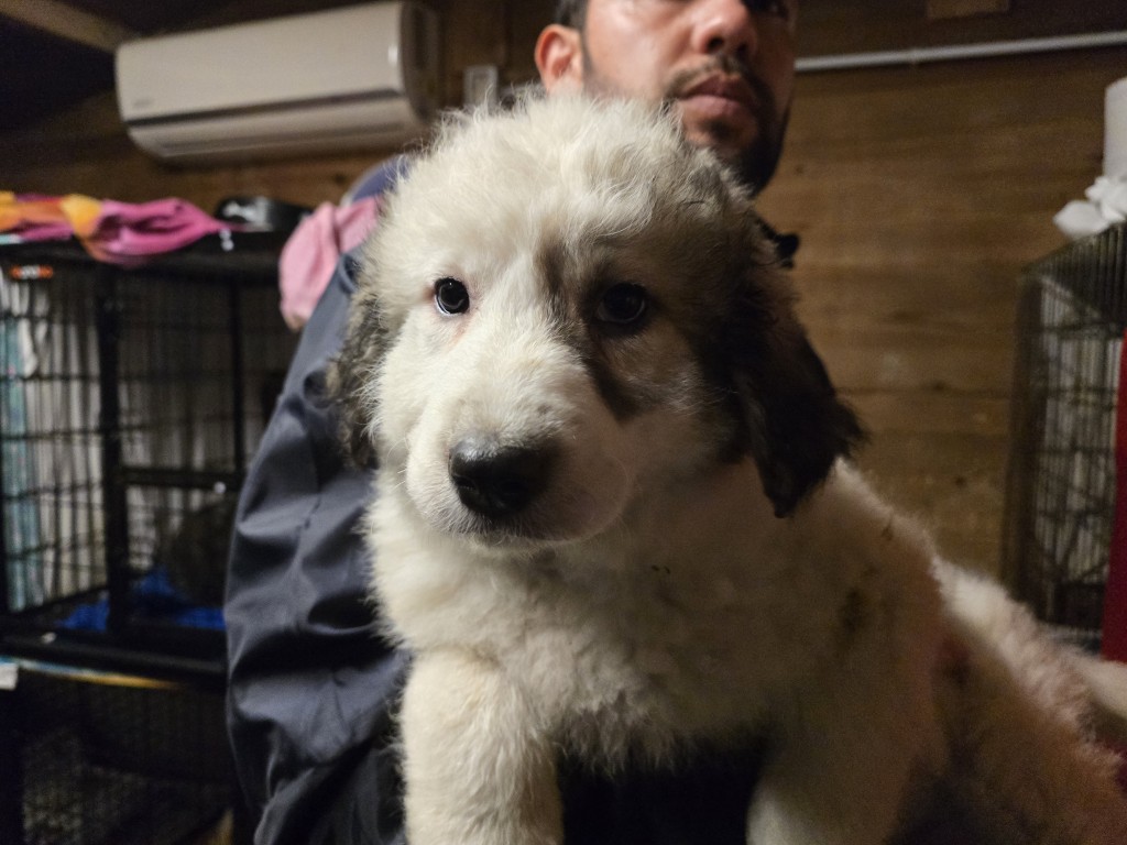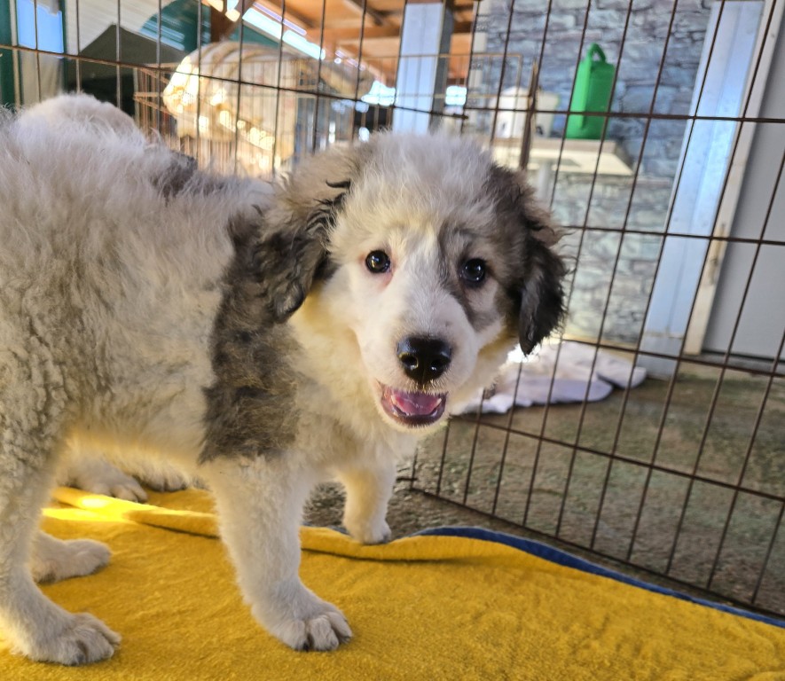 Balma sieht fast identisch aus wie Bruder Baxter, allerdings hat sie ein paar dunkle Flecken auf dem Rücken. Sie ist welpentypisch verspielt, freut sich über jede Abwechslung, will spielen, toben, schmusen – alles das, was Hunde in diesem Alter so machen. Leider haben die drei in ihrem Welpenställchen nur sehr wenig Platz und so hat auch das Spielen und Toben seine Grenzen.