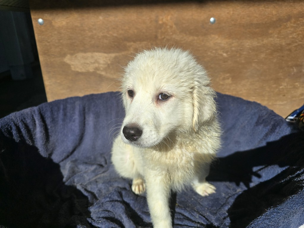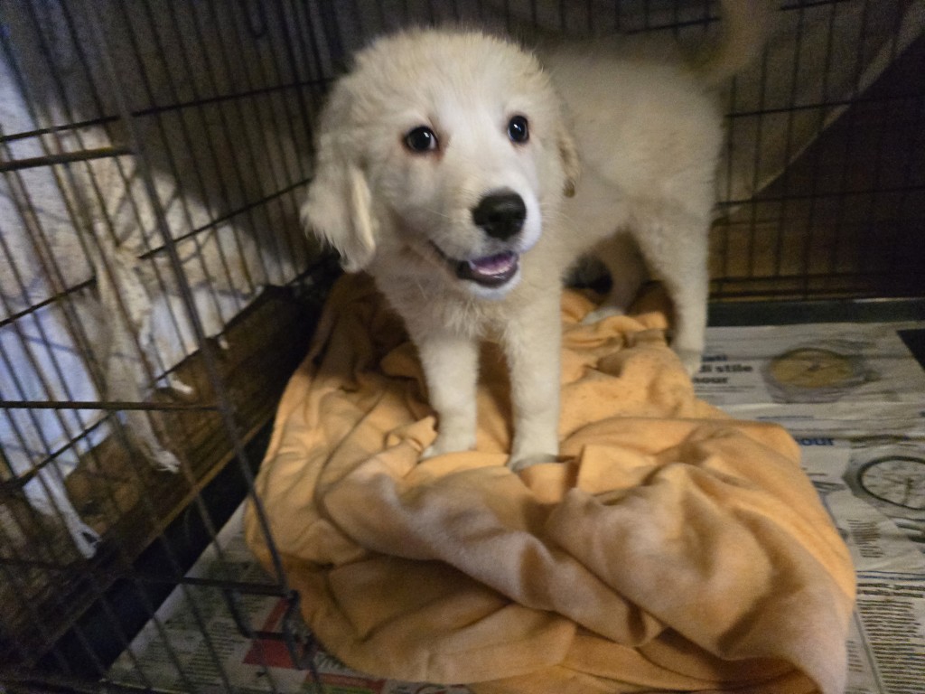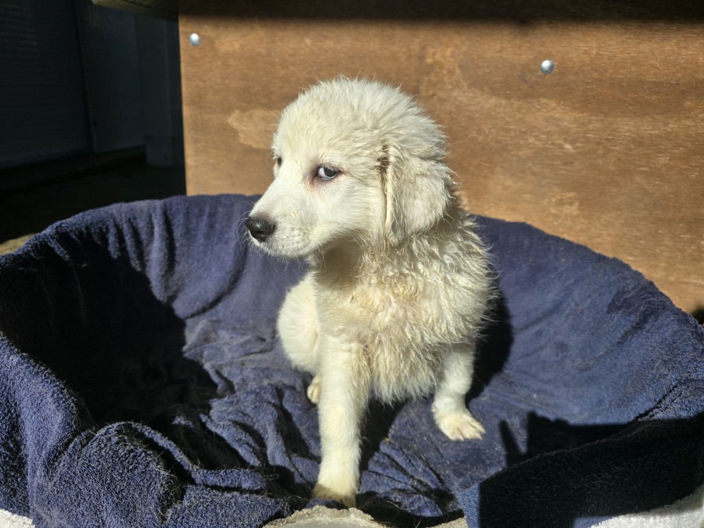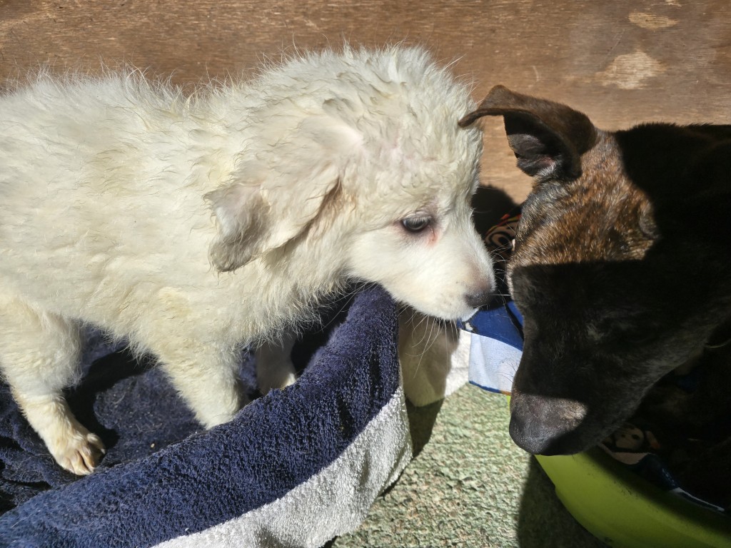 Betty hat im Gegensatz zu ihren Geschwistern komplett weißes Fell. Sie ist welpentypisch verspielt, freut sich über jede Abwechslung, will spielen, toben, schmusen – alles das, was Hunde in diesem Alter so machen. Leider haben die drei in ihrem Welpenställchen nur sehr wenig Platz und so hat auch das Spielen und Toben seine Grenzen.