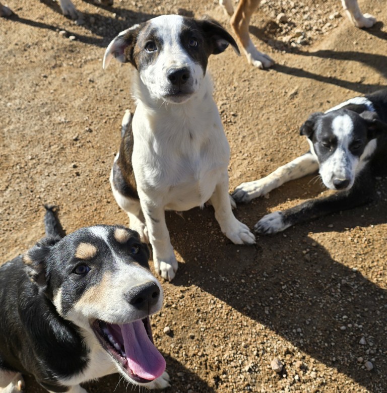 6 kleine Welpen im Nirgendwo – mit ganz vielen Schutzengeln, die dafür sorgten, dass die Menschen, die vorbeigingen, nicht wegsahen, sondern sie zur LIDA, unserem Kooperationstierheim brachten. Hier sind sie in Sicherheit, werden versorgt und wachsen nun zu hübschen Junghunden heran. Es sind „kunterbunte“ Geschwister: von beige bis schwarz ist alles dabei. Sie werden zwischen 50 und 55 cm groß. Es sind 4 Mädchen und 2 Jungs, die jetzt hier auf ihre Familien warten.