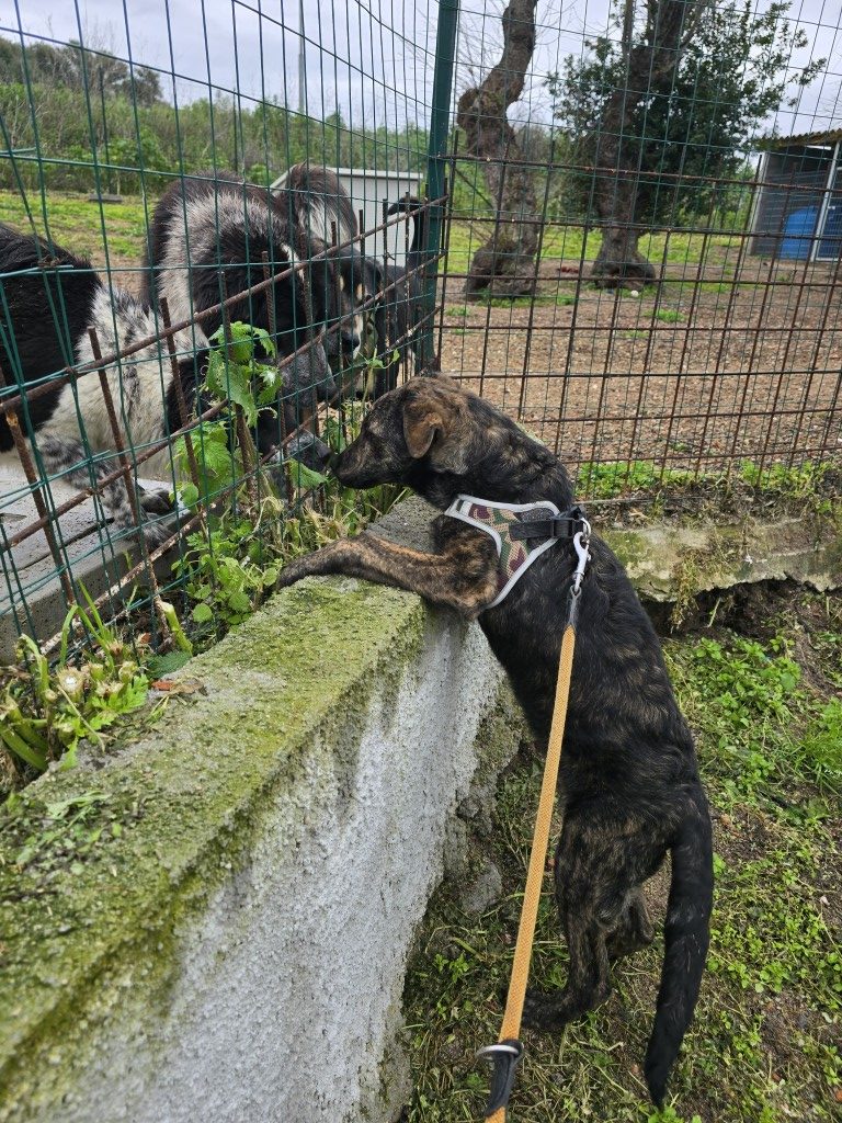 Im Innenhof, wo sie für eine kurze Zeit frei laufen kann, zeigt sie sich sozial mit den anderen Hunden. Ruft man sie, kommt sie angelaufen und drückt sich ganz fest an einen. Sie liebt es, gestreichelt zu werden.