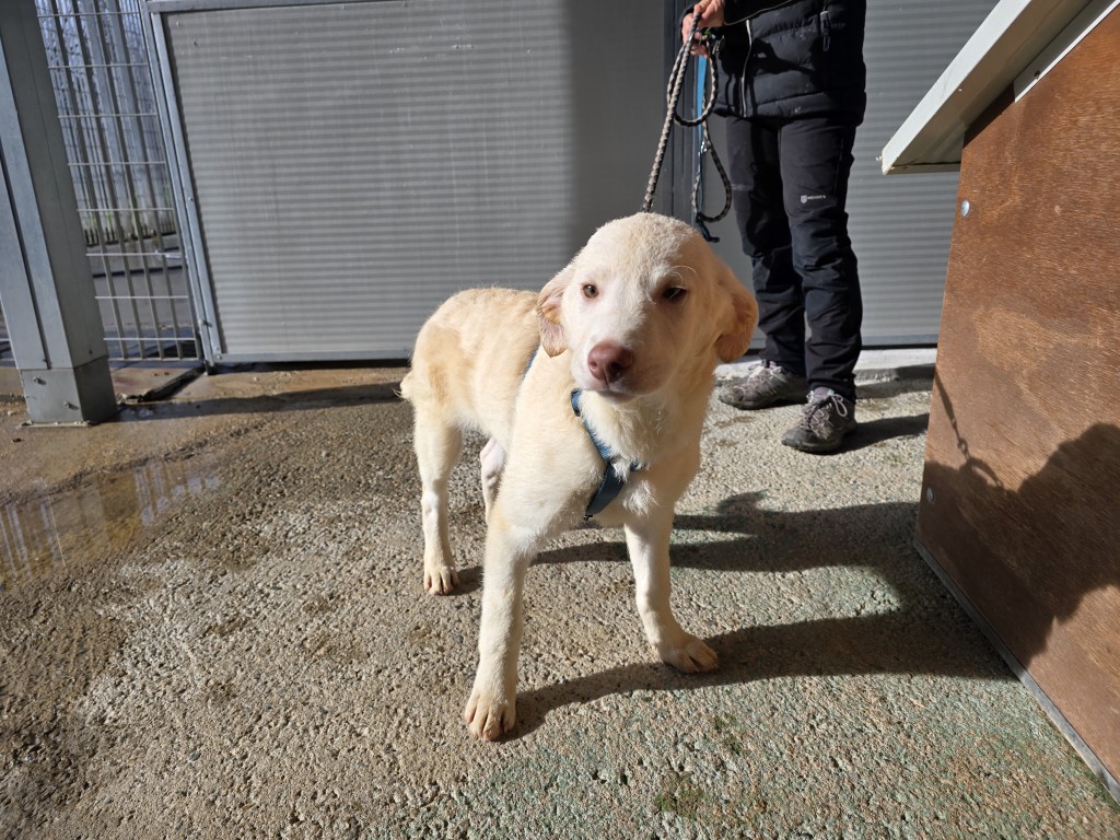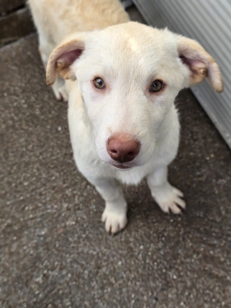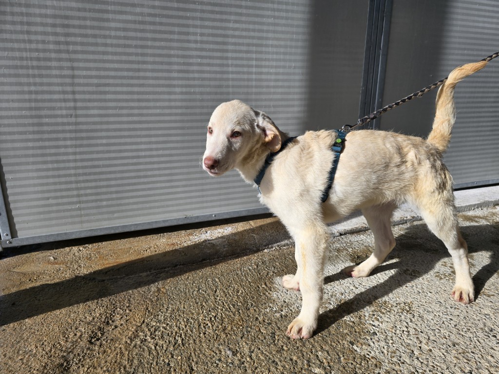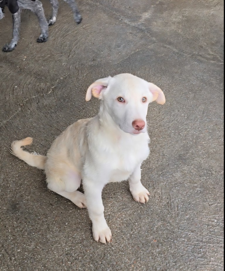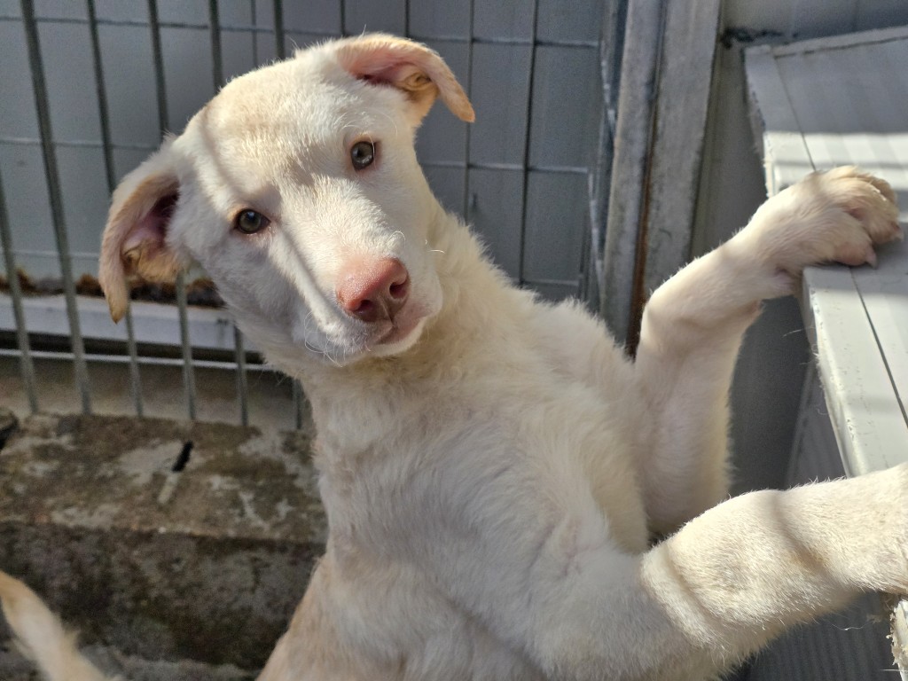Kalif ist ein hübscher Junghund mit einer rosa Nase und grün-goldenen Augen. Er ist sehr sozial, tobt und spielt mit den anderen Welpen und wenn dann noch ein Mensch zu „Besuch kommt“ der mit ihm spielt und kuschelt, ist der Tag perfekt.