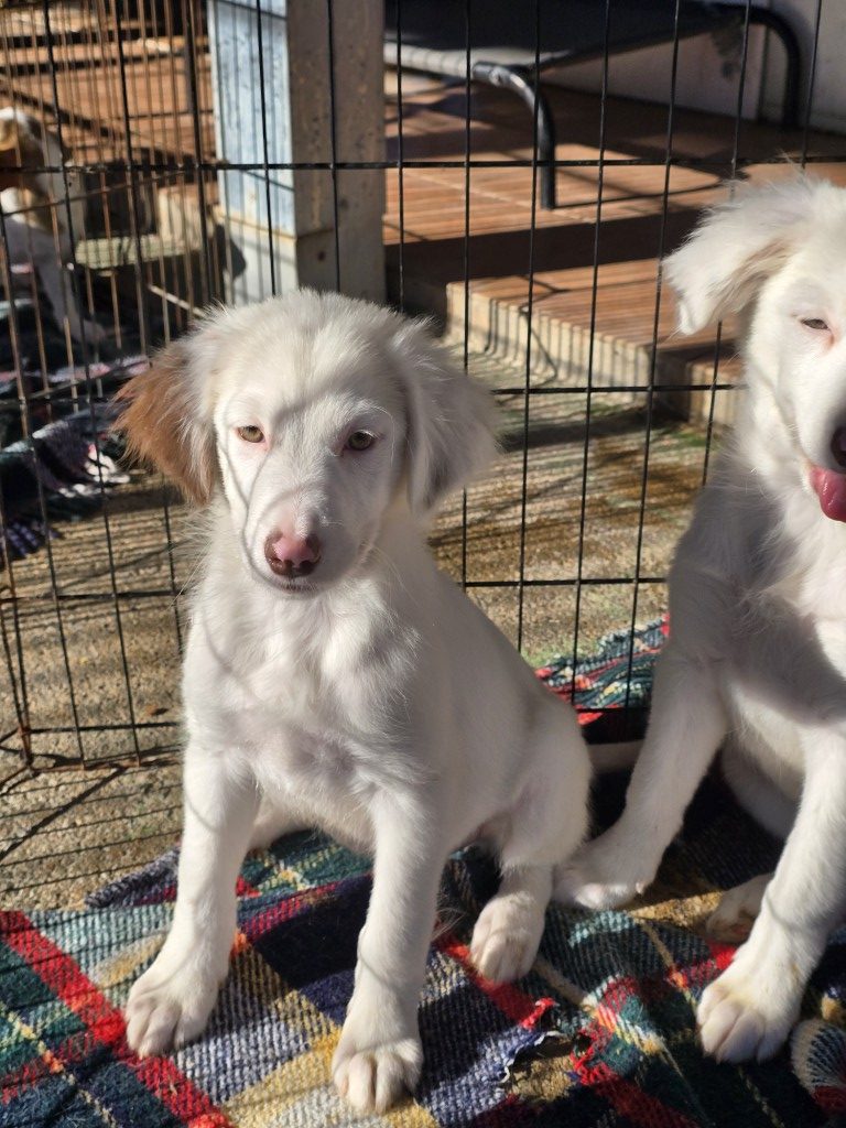Im Moment leben sie in einem Welpenställchen. Hier können sie spielen, toben und auch zusammen kuscheln oder das Treiben im Hof beobachten.