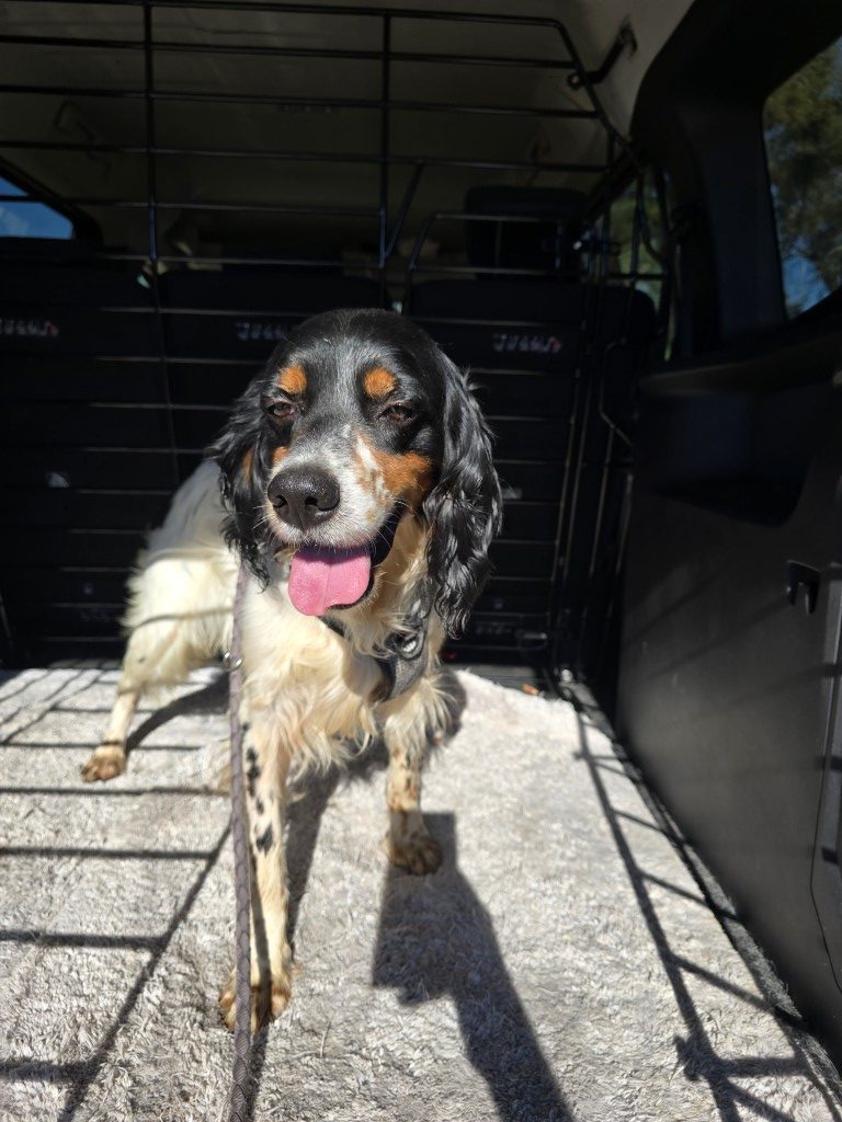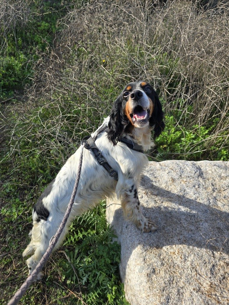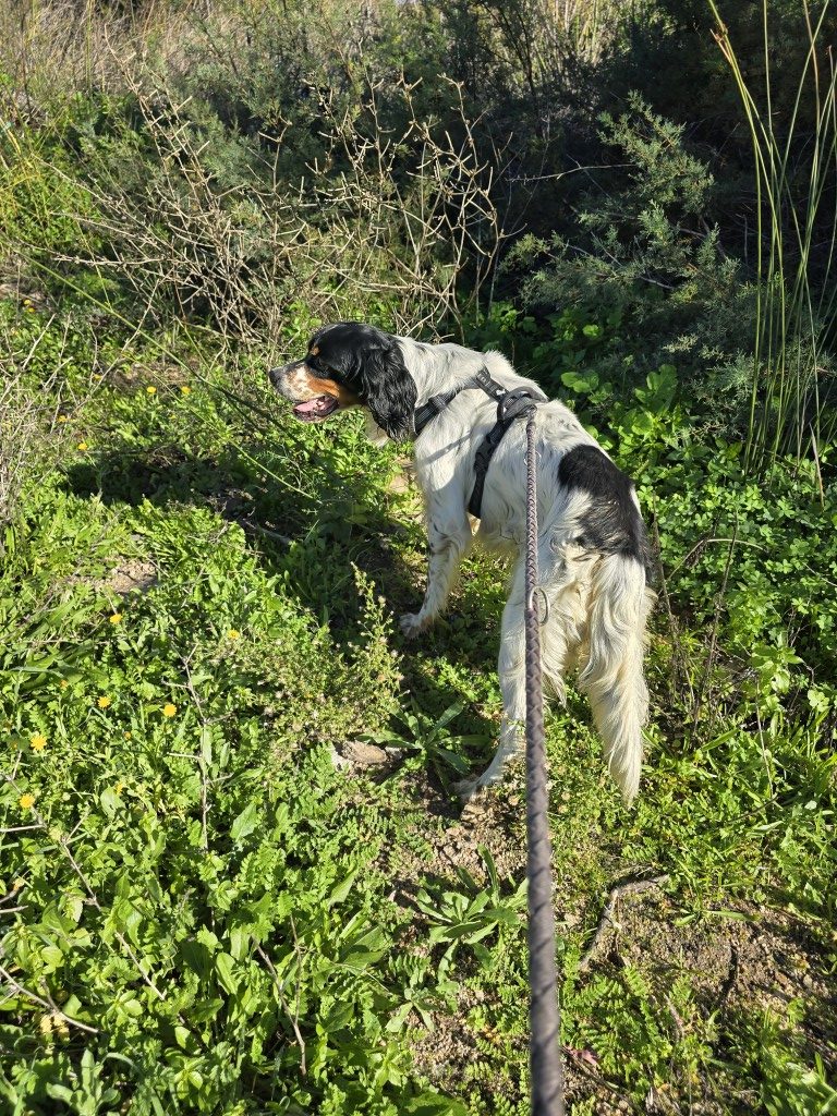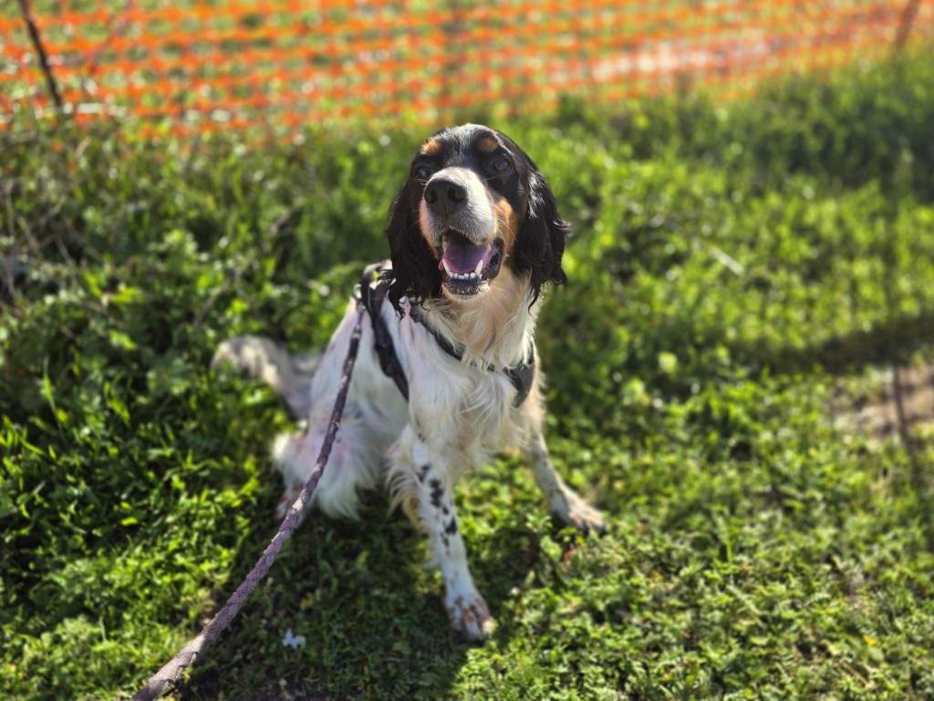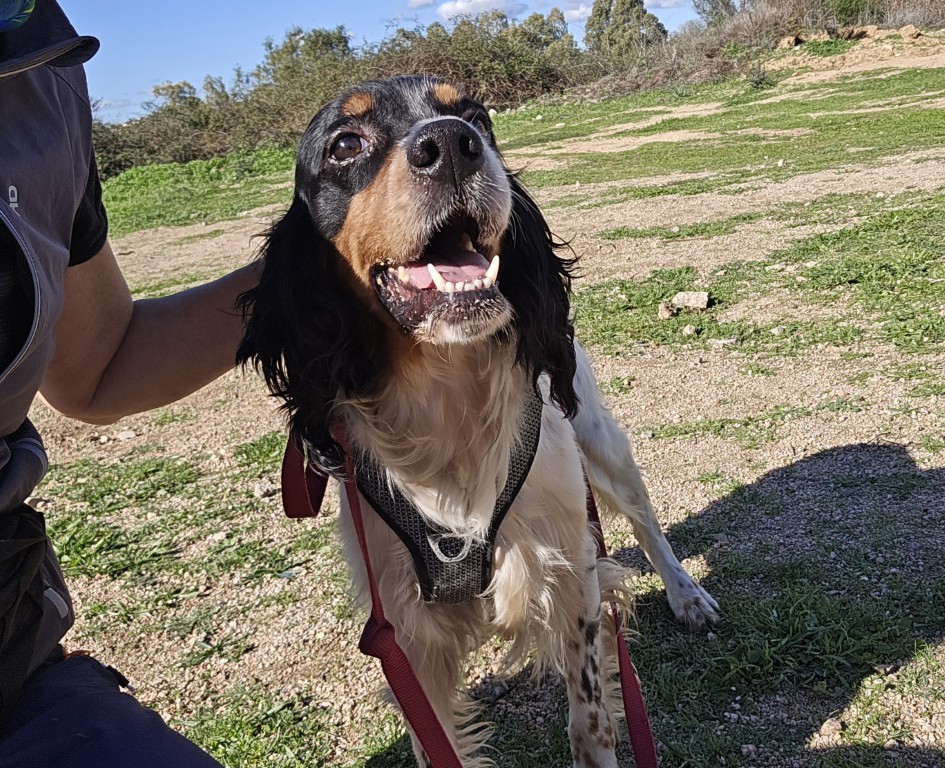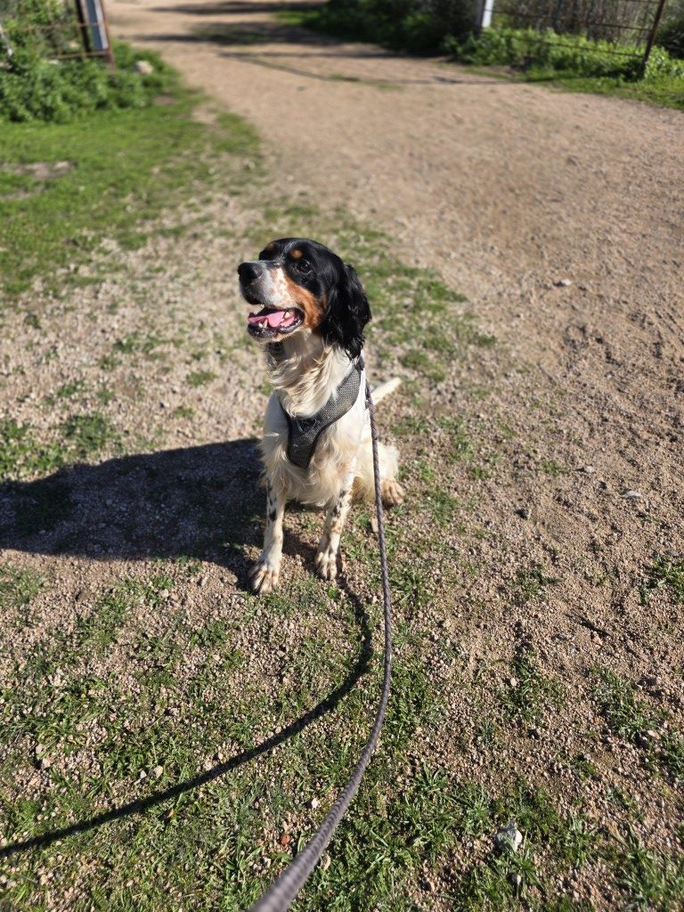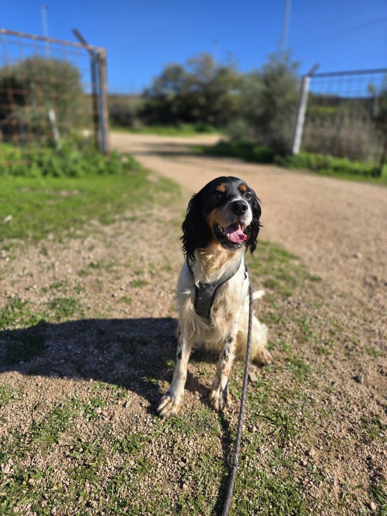 Moreno gehörte einem Jäger. Leider war er aus dessen Sicht nicht jagdtauglich und wurde im Tierheim abgegeben. Moreno ist ein Englisch Setter Mix, für diese Rasse aber eher klein und zierlich. Wahrscheinlich stecken auch Bretonen-Gene ihn ihm.
